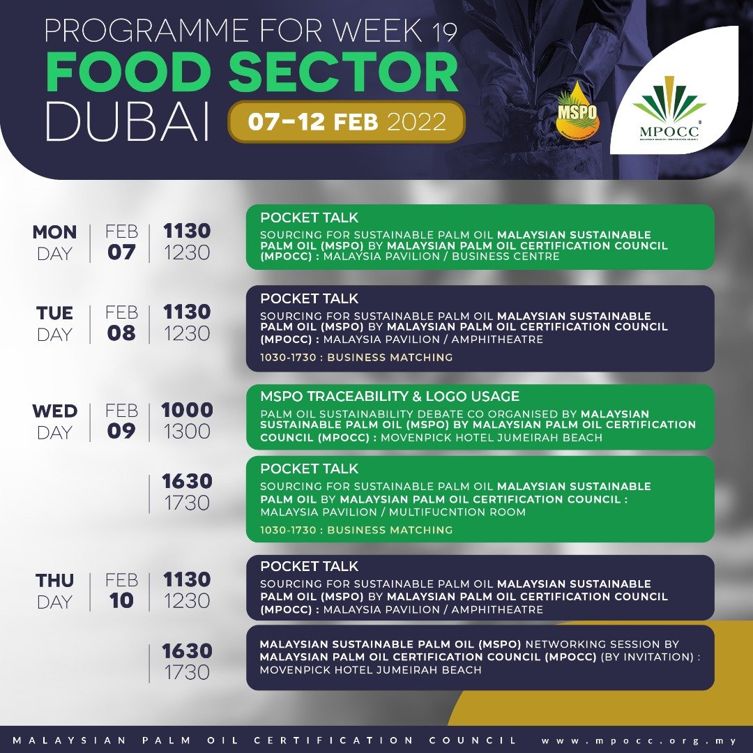 Hence, MPOCC is taking the advantage of having all stakeholders and prominent figures in one place during World Expo 2022 by organising a networking session to introduce MPOCC as the scheme owner of MSPO and to explore any potential partnership and collaboration in adopting, adapting and embracing the MSPO scheme.